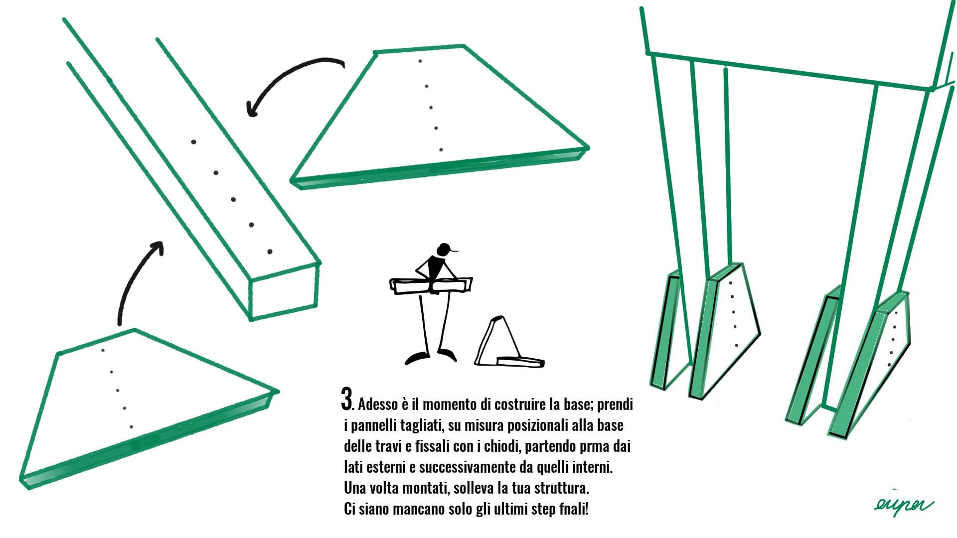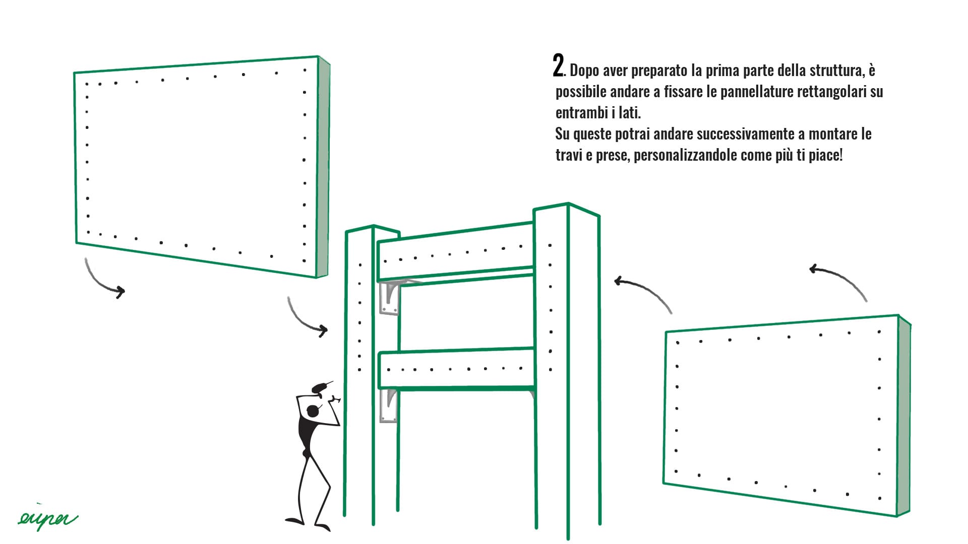 - Per finire partendo dai lati esterni e poi a quelli interni, fissa i 4 Pannelli rimanenti, quelli tagliati su misura, che andranno a sostenere la base della Climbing Training Station. Figura 3.