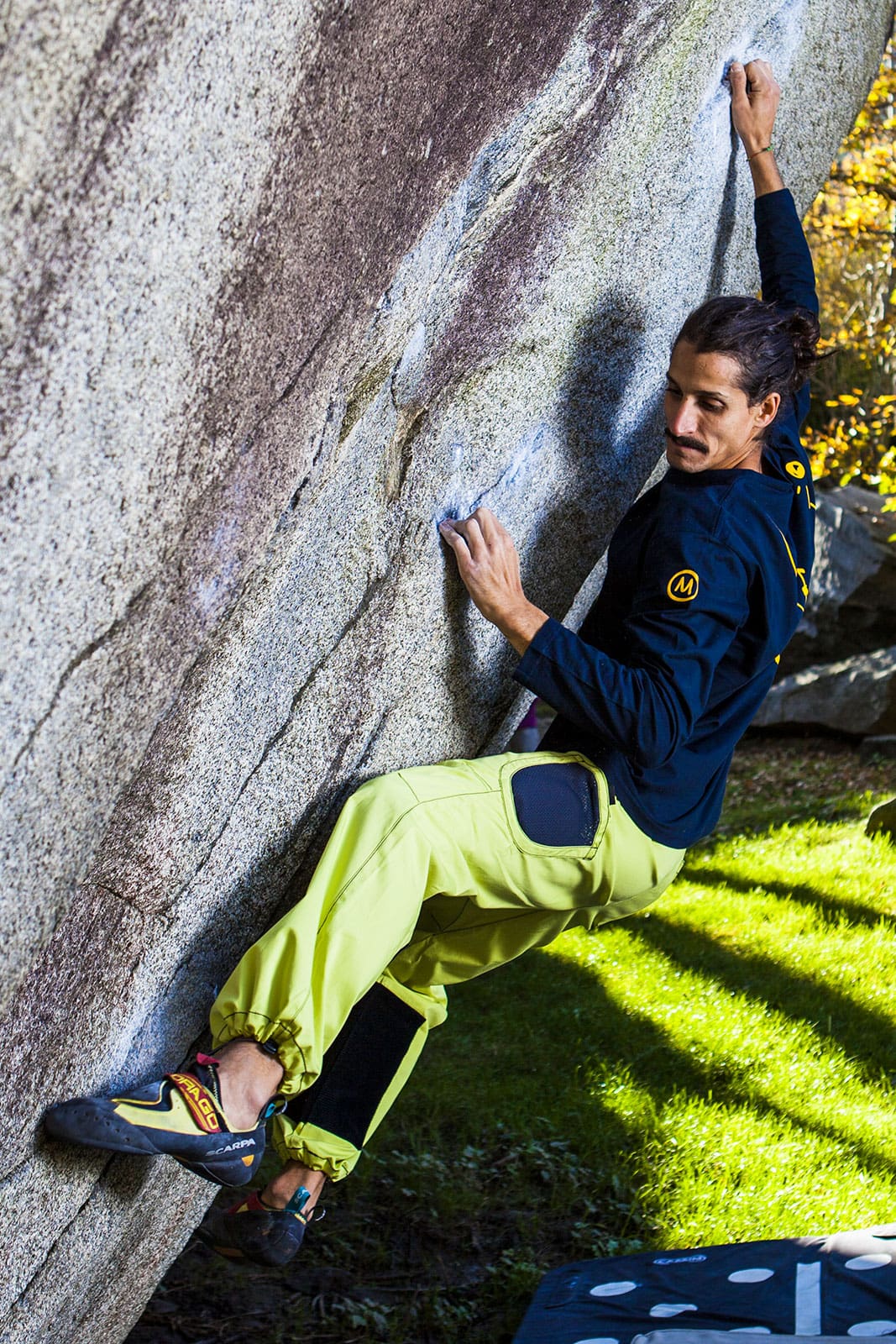 Un pantalone unico per arrampicata con tasche laterali porta magnesite integrate e toppe in velluto a fondo gamba per la pulizia delle scarpette.